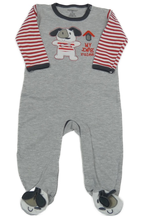Šedo-červeno-bílý overal s pejskem