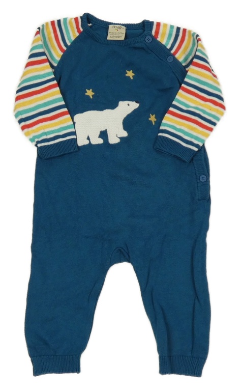Petrolejovo-pruhovaný pletený overal s medvídkem frugi
