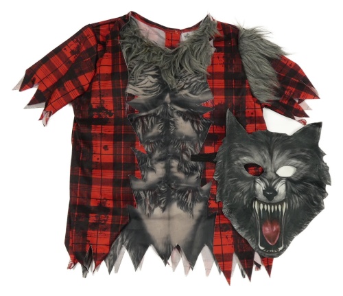Kostým - 2 set - červeno-šedé triko s kožešinou + maska - vlkodlak