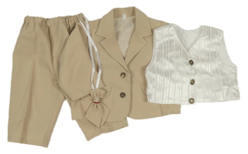 4set - Béžové slavnostní sako + kalhoty + bílá pruhovaná vesta + béžový motýlek