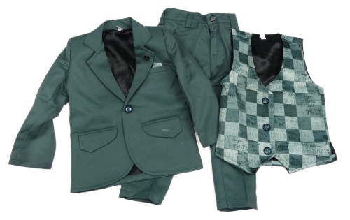 3Set - Khakišedé sako + kalhoty + khaki-olivová kostkovaná vesta s nápisy