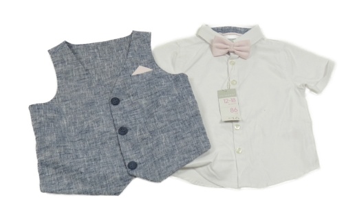 • Nové - 2 set - bílá košile s růžovým motýlkem + tmavomodrá melírovaná společenská vesta Primark