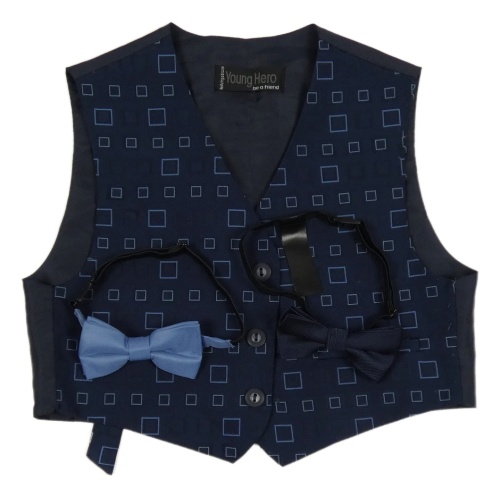 • 3set - Tmavomodrá kostkovaná společenská vesta + připínací světlemodrý + tmavomodrý motýlek