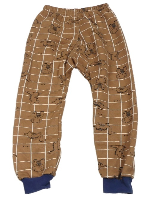 Hnědo-bílo-tmavomodré kostkované teplé tepláky s dinosaury