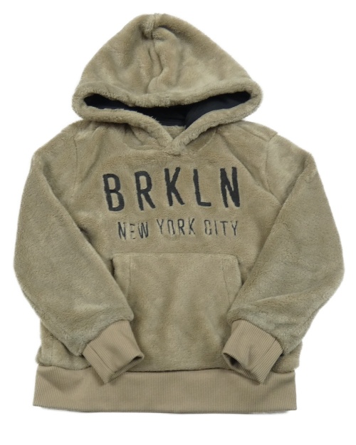 Hnědošedá plyšová mikina s nápisy a kapsou a kapucí
