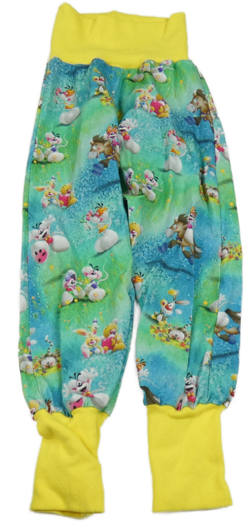 Modro-zeleno-žluté lehké tepláky se zvířaty