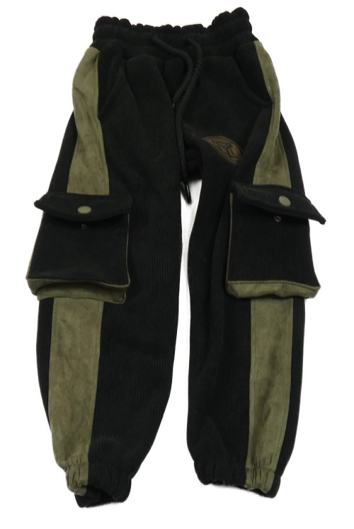 Černo-khaki žebrované sametové silnější tepláky s kapsami