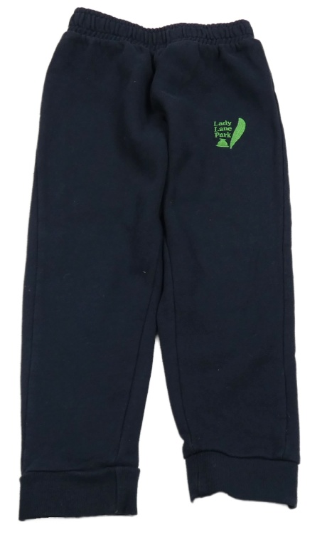 Tmavomodré tepláky se zeleným vyšitým nápisem