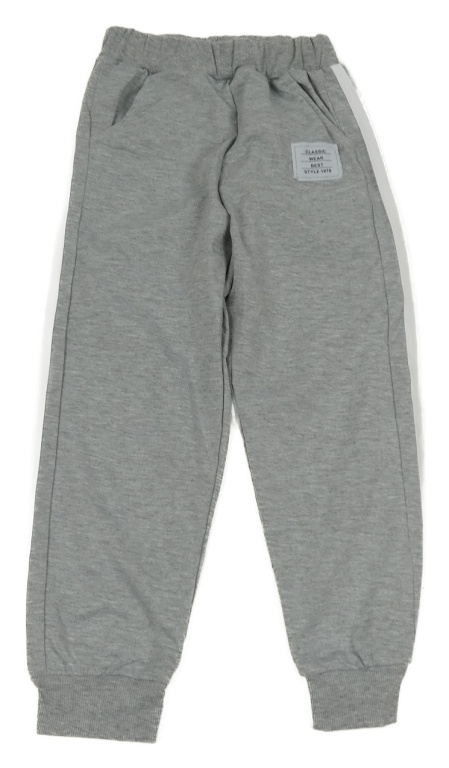 Šedé tepláky s bílými pruhy a nášivkou