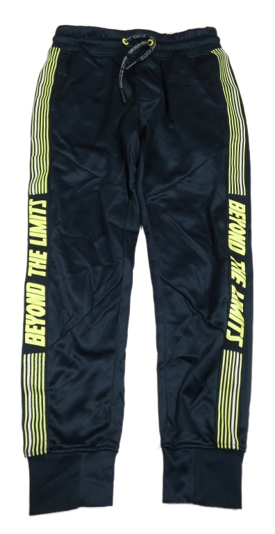 Tmavomodré sportovní tepláky s pruhy a nápisem
