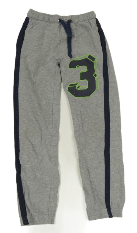 Šedé tepláky s tmavomodrým pruhem a číslem