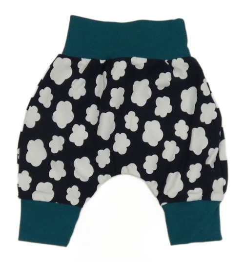 Tmavomodro-bílé vzorované lehké tepláky s petrolejovým lemem