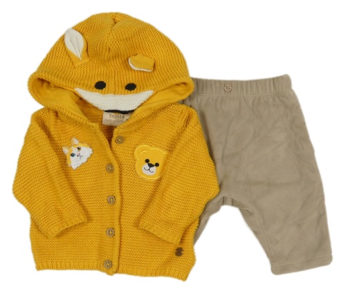 2 set - Žlutý propínací svetr s medvědem a kapucí + béžové sametové tepláky