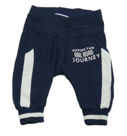 Tmavomodro-bílé tepláky s pruhy a nápisy