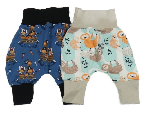 2x lehké tepláky modro-béžovo s lenochody+ tmavomodré s piráty