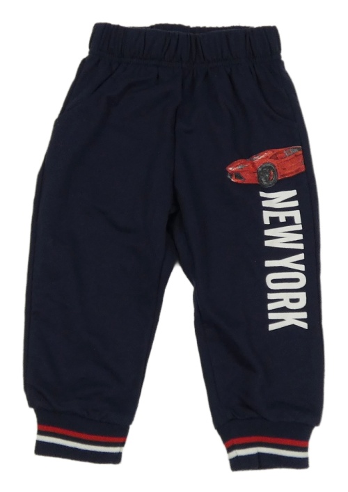 Tmavomodré tepláky s autem a nápisy
