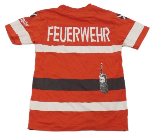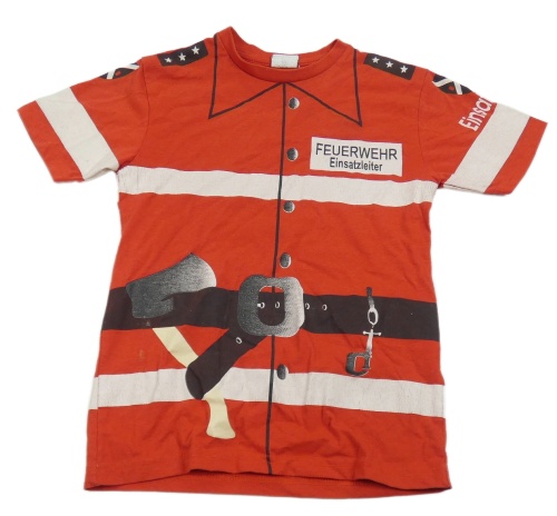 Červeno-bílé pruhované tričko s potiskem hasiče