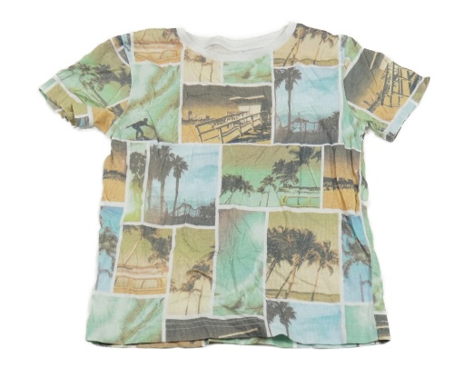 Světlemodro/zeleno-pískové tričko s palmami a pláží Peacocks