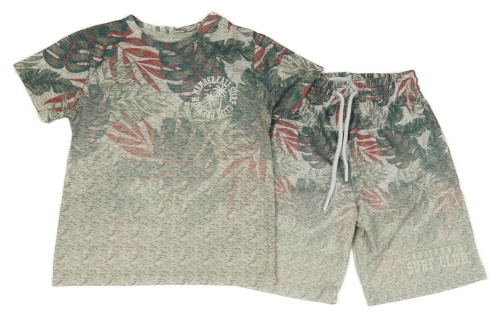 2Set - Smetanovo-šedé melírované tričko s listy a palmami a nápisy + teplákové kraťasy PRIMARK
