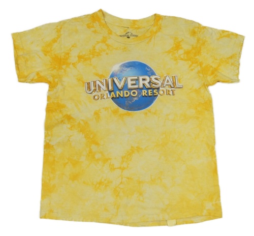 Žluto-oranžové batikované tričko s planetou a nápisy