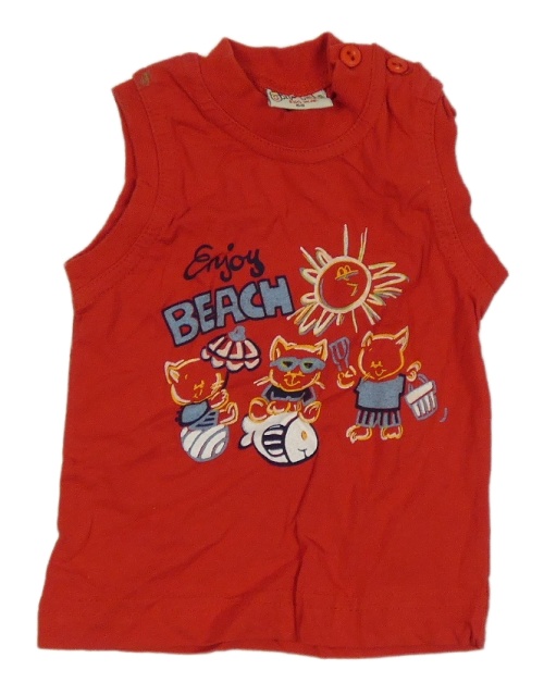Červené tílko s kočičkami a nápisy a sluníčkem