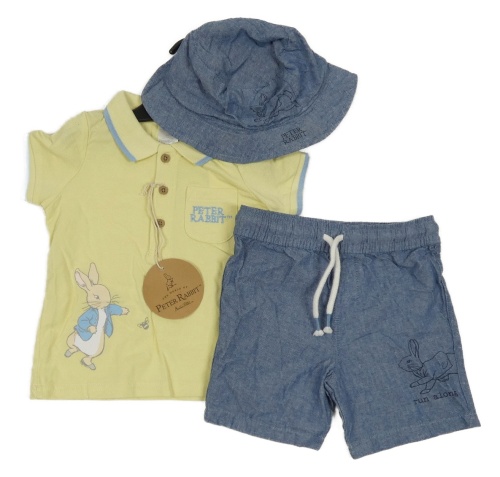 Nové - 3set - Žluté polo tričko s Králíčkem Petrem + tmavomodré melírované kraťasy + klobouk