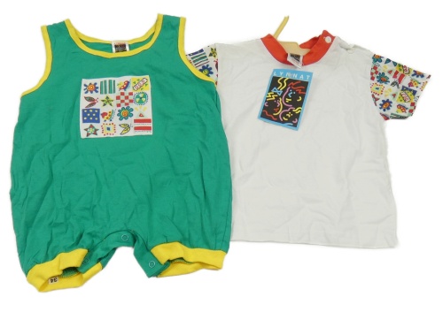 Nové - 2 set - bílo-barevné tričko + zeleno-žlutý kraťasový overal s nášivkou