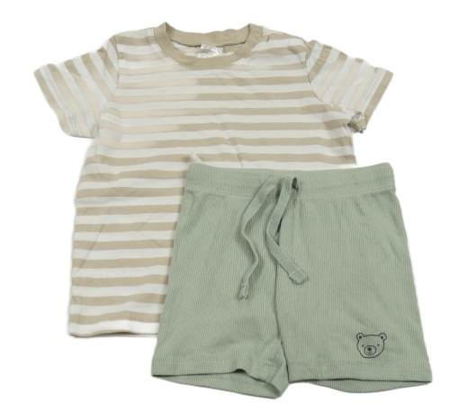 2set - Béžovo-bílé pruhované tričko + zelené žebrované kraťasy s medvědem H&M