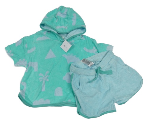 Nové - 2Set - Světletyrkysové froté oversize tričko s dinosaury a palmami a kapucí + světlemodré kraťasy Next