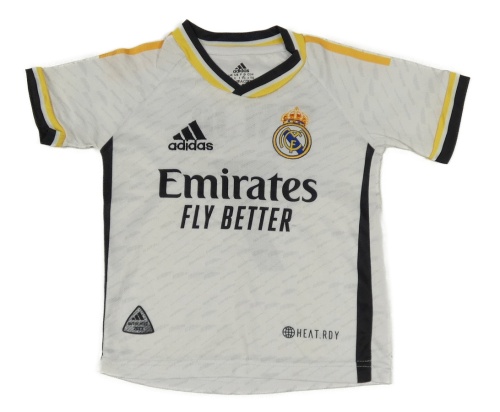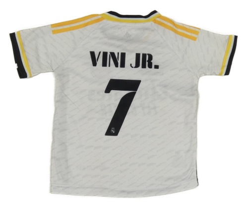 Bílý fotbalový dres s erbem Real Madrid a logem Adidas