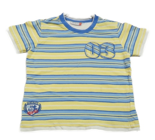 Modro-žluto-bílé pruhované tričko s číslem Berti