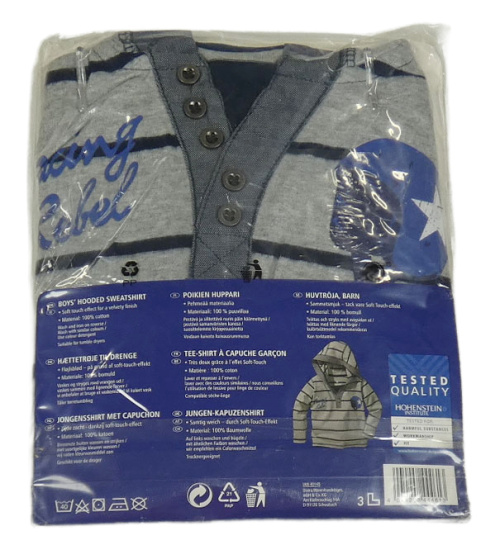 Nové - Šedo-tmavomodrá pruhovaná mikina s nápisem a helmou a kapucí