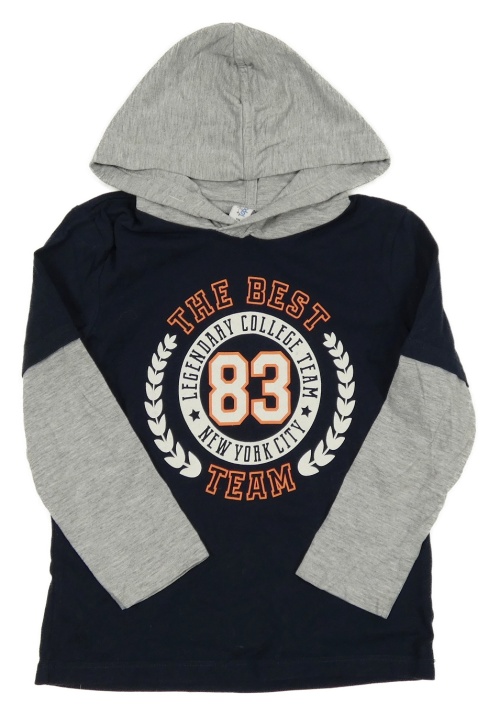 Tmavomodro-šedé triko s číslem a nápisy a kapucí Topolino