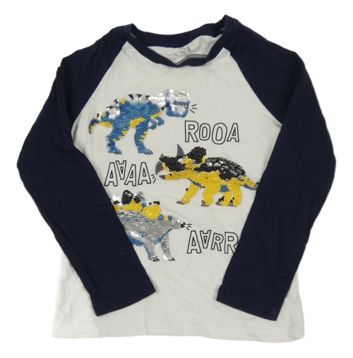 Bílo-tmavomodré triko s dinosaury z překlápěcích flitrů C&A