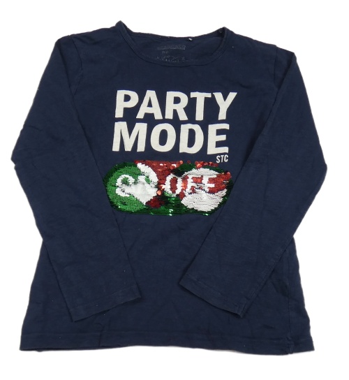 Tmavomodré triko s nápisem a obrázkem z překlápěcích flitrů Staccato
