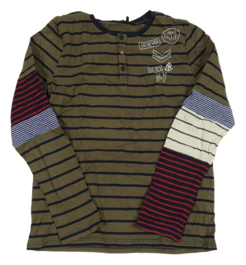 Khaki-tmavomodré pruhované triko s výšivkou a barevnými rukávy