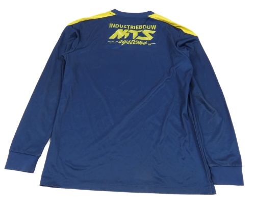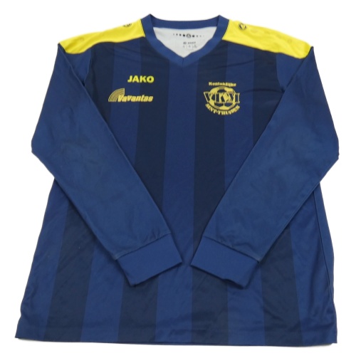 Tmavomodro-žlutý pruhovaný sportovní fotbalový dres s míčem a nápisy JAKO