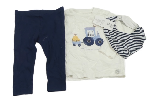 Nové - 3 set - bílé triko s traktorem + tmavomodré lehké tepláky + vílo-tmavomodrý pruhovaný slinták F&F