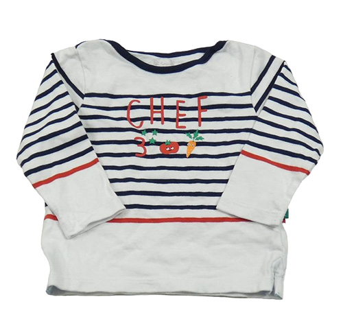 Bílo-tmavomodro-červené triko s pruhy a nápisem