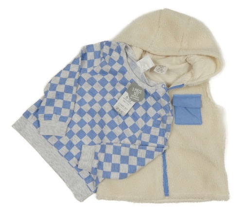 Nové - 2 set - smetanová huňatá podšitá vesta s kapucí + šedo-modré kostkované triko Pep&Co