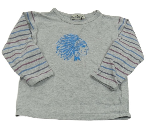 Šedo-barevné triko s indiánem a pruhy na rukávech