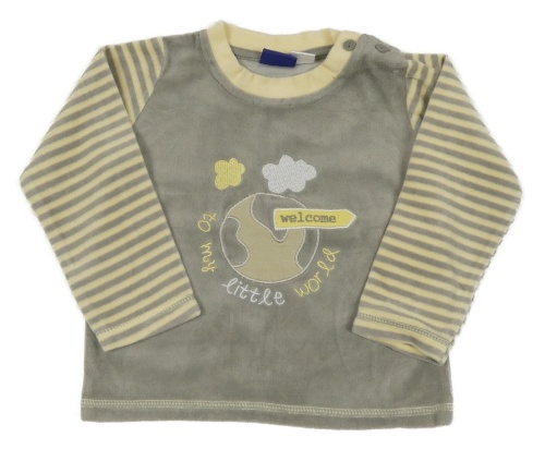 Šedo-žluté sametové triko se zeměkoulí a pruhy na rukávech Lupilu