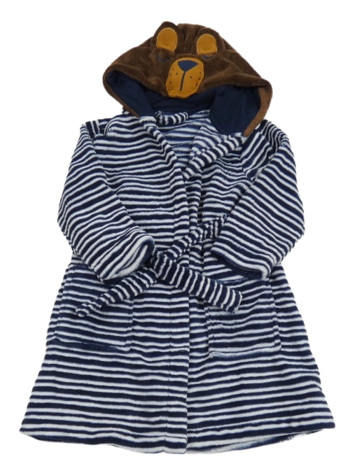 Tmavomodro-bílo-hnědý pruhovaný chlupatý župan s kapucí - medvěd George