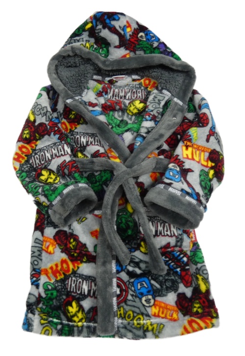 Šedý chlupatý župan s hrdiny a kapucí Marvel