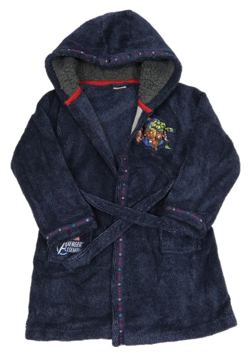 Tmavomodro-šedý chlupatý župan s hrdiny a kapucí