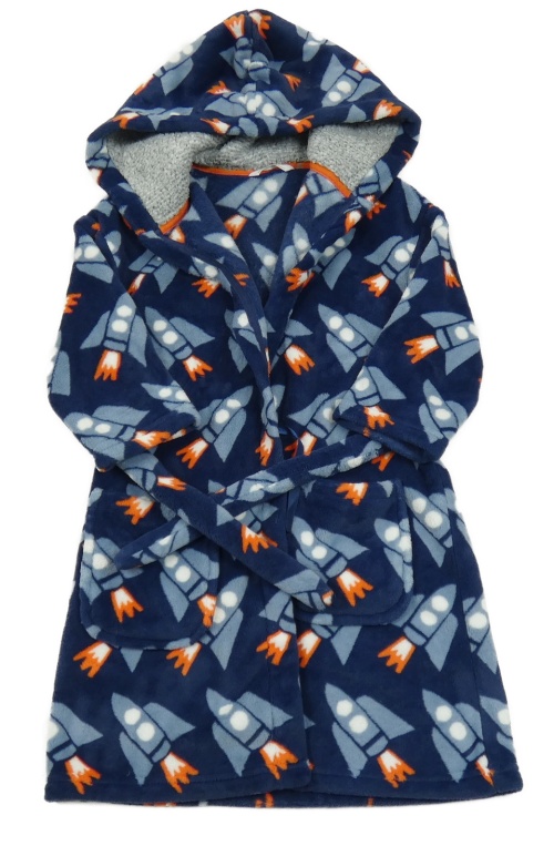 Tmavomodrý plyšový župan s raketami a kapucí M&S