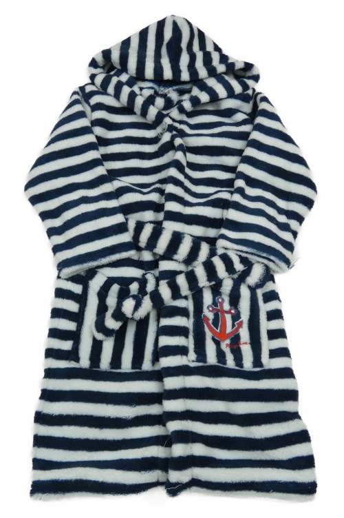 Tmavomodro-bílý pruhovaný chlupatý župan s kapucí