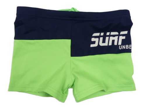 Tmavomodro-neonově zelené nohavičkové plavky s nápisy