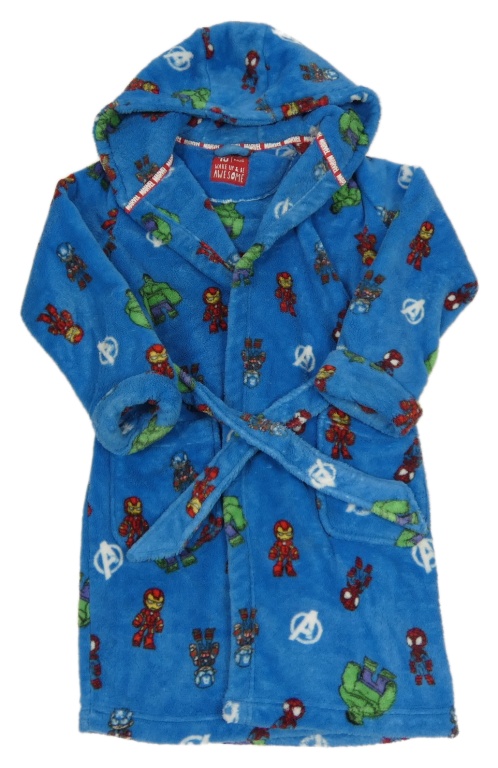 Modrý plyšový župan se superhrdiny a kapucí Tu