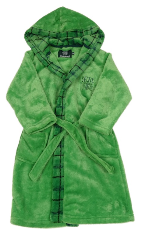 Zelený chlupatý župan s kostkovaným lemem a kapucí